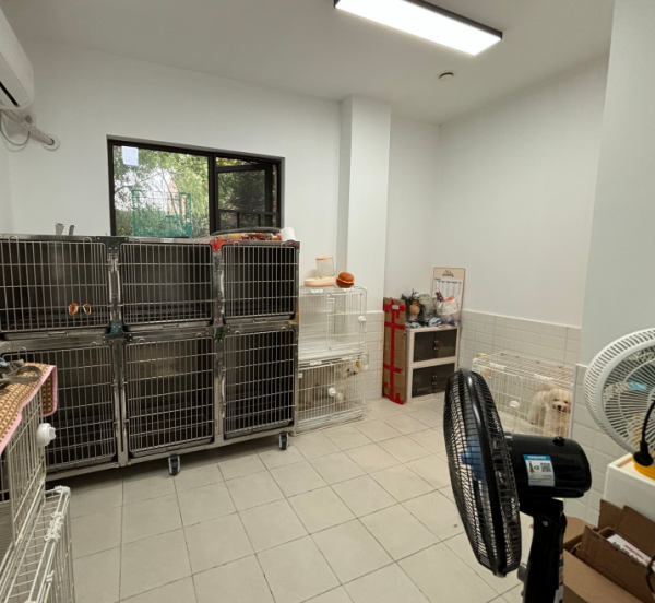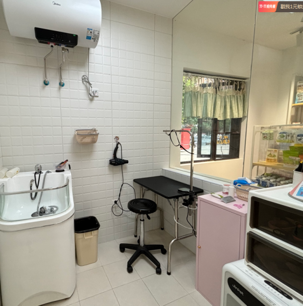 狗洗护区干湿分离。狗洗护区美容桌圆的2个长的2个一个是升降长桌。英坤吹水机1个,英坤电吹风2个。英坤推剪2个。Jirpet大型烘干机一个。,猫洗护单独一体浴缸一个,长的美容桌一个,猫咪抽水机英坤,猫咪jirpet烘干箱,寄养室,白色笼子三个,医护一体式不锈钢大笼子六个,猫咪寄养室,三层木质猫柜,美的空调挂机两个,美的热水器两个,新风系统两机,电风扇两个,沙发一个,小圆桌两个,一个大吧台 ,加两个吧台凳子,饮水机一个,货架四个